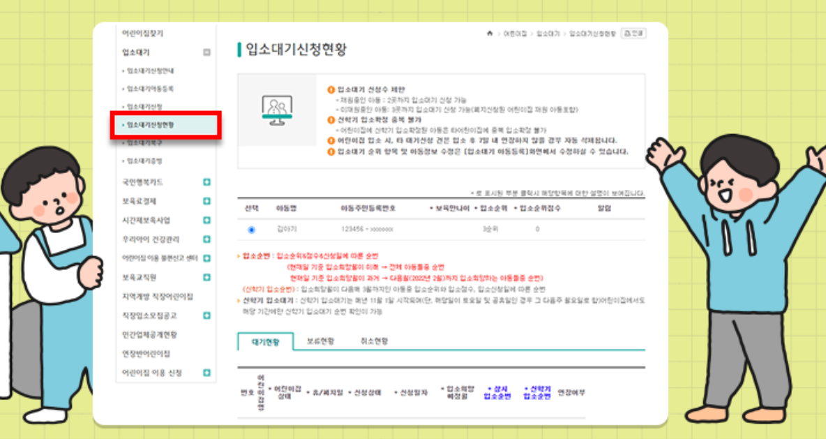 입소 대기 신청 현황 메뉴에서 입소 대기 신청을 완료한 내역을 확인합니다.