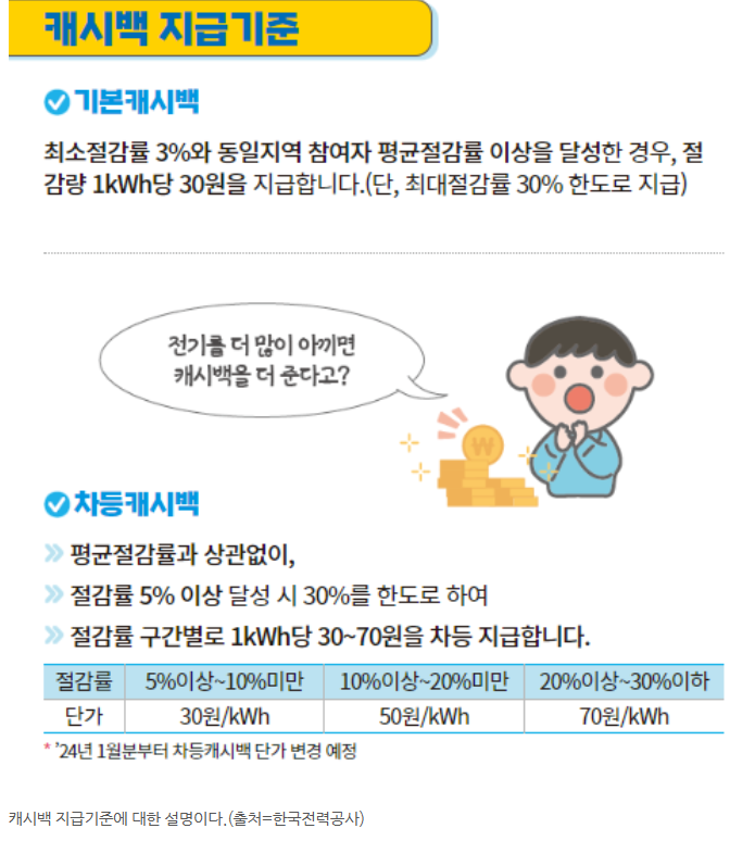 전기 사용량을 전년 동월 대비 10% 감축하면 현금 등으로 돌려받을 수 있습니다. 기본캐시백은 최소절감률 3%에 동일 지역 참여자 평균절감률 이상을 달성한 경우 절감량 1 kWh 당 30원을 지급합니다. 캐시백은 다음 달 전기요금에서 차감하여 청구되며, 캐시백 지급 기준은 아래 그림과 같습니다.