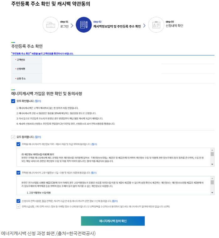 먼저, 한국전력 에너지캐시백 누리집에서 로그인 후 에너지캐시백 지급 신청을 합니다. 캐시백 정보와 주민등록 주소를 확인하고, 필수 동의사항에 체크합니다.