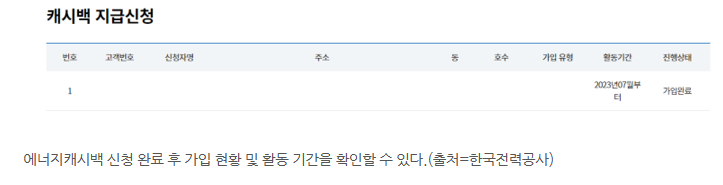 에너지캐시백 참여 확인 신청을 완료하면 캐시백 지급 신청 화면에서 현황을 살펴볼 수 있습니다.