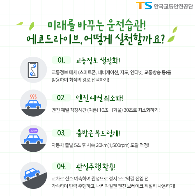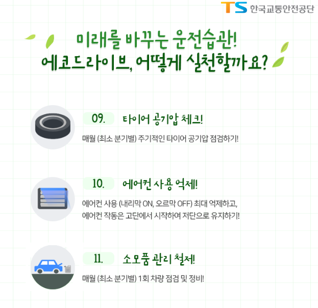 미래를 바꾸는 운전습관! 에코드라이브 어떻게 실천할 수 있을까요? 에코드라이브를 실천할 수 있는 방법 11가지를 소개해 드리겠습니다.