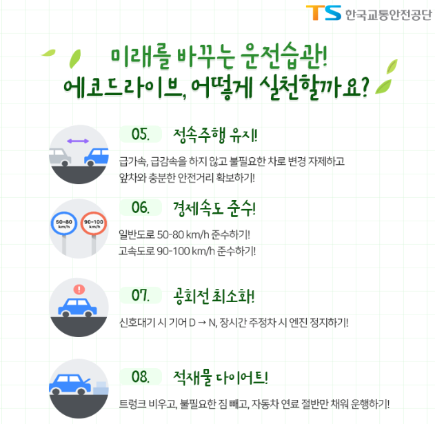 교차로 신호 예측하여 관성으로 정지 오르막길 진입 전 가속하여 탄력 주행하고, 내리막길에는 엔진 브레이크 적절히 사용하기