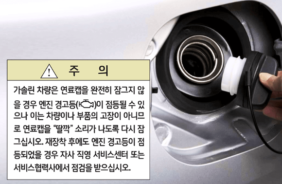 특히 셀프주유 후 주유캡을 '딸깍' 소리가 나도록 잠그지 않은 경우, 매뉴얼에 나와있는 것처럼 엔진경고등이 점등될 수 있습니다. 주유구가 열려있으면 연료탱크에서 유증기가 발생해 대기 중으로 유해가스가 날아가는 상황이 되기 때문입니다.