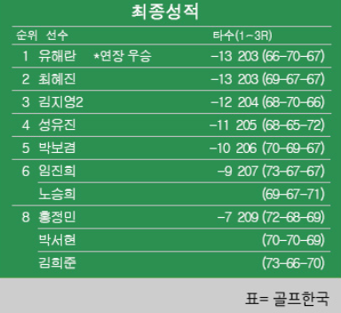 유해란은 1~3라운드 합계 13언더파 203타를 기록했고 최혜진(롯데골프단)과 함께 연장전을 치러 마지막에 웃었다고 합니다.