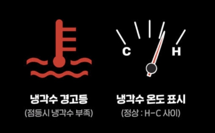 계기판에 빨간색 냉각수 경고등이 뜨거나 냉각수 온도계의 눈금이 C나 H쪽으로 지나치게 기울어져 있다면 심각한 상태로, 되도록 정비소에 방문해서 점검을 받아봐야 합니다.