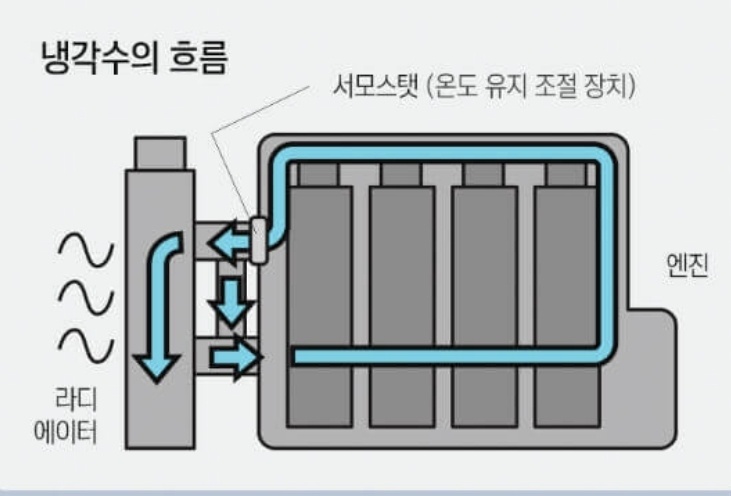 엔진은 위 그림과 같이 주행 중 과열되지 않도록 장치가 마련되어 있습니다. 냉각수는 엔진과 라디에이터를 순환하며 엔진열을 식혀주는 역할을 합니다.
