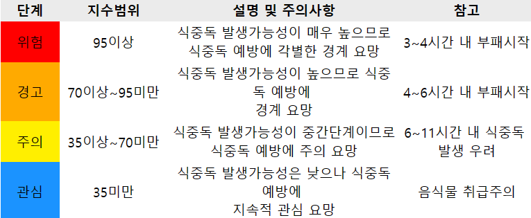 먼저 식중독은 식품이나 물의 섭취에 의해 발생했거나 발생한 것으로 판단되는 감염성, 독소형 질환을 말합니다. 식중독지수는 온도와 미생물 증식 기간의 관계를 고려해 식중독 발생 가능성을 백분율로 나타낸 수치입니다. 여름철 식중독을 예방하고 국민의 위생을 위해 식품의약품안전처에서 개발했다고 합니다.