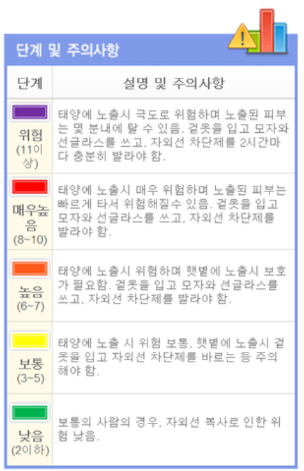 우리동네 자외선지수가 어떤 단계인지 확인할 수 있습니다. 또 각 단계별 주의사항도 나와있습니다.