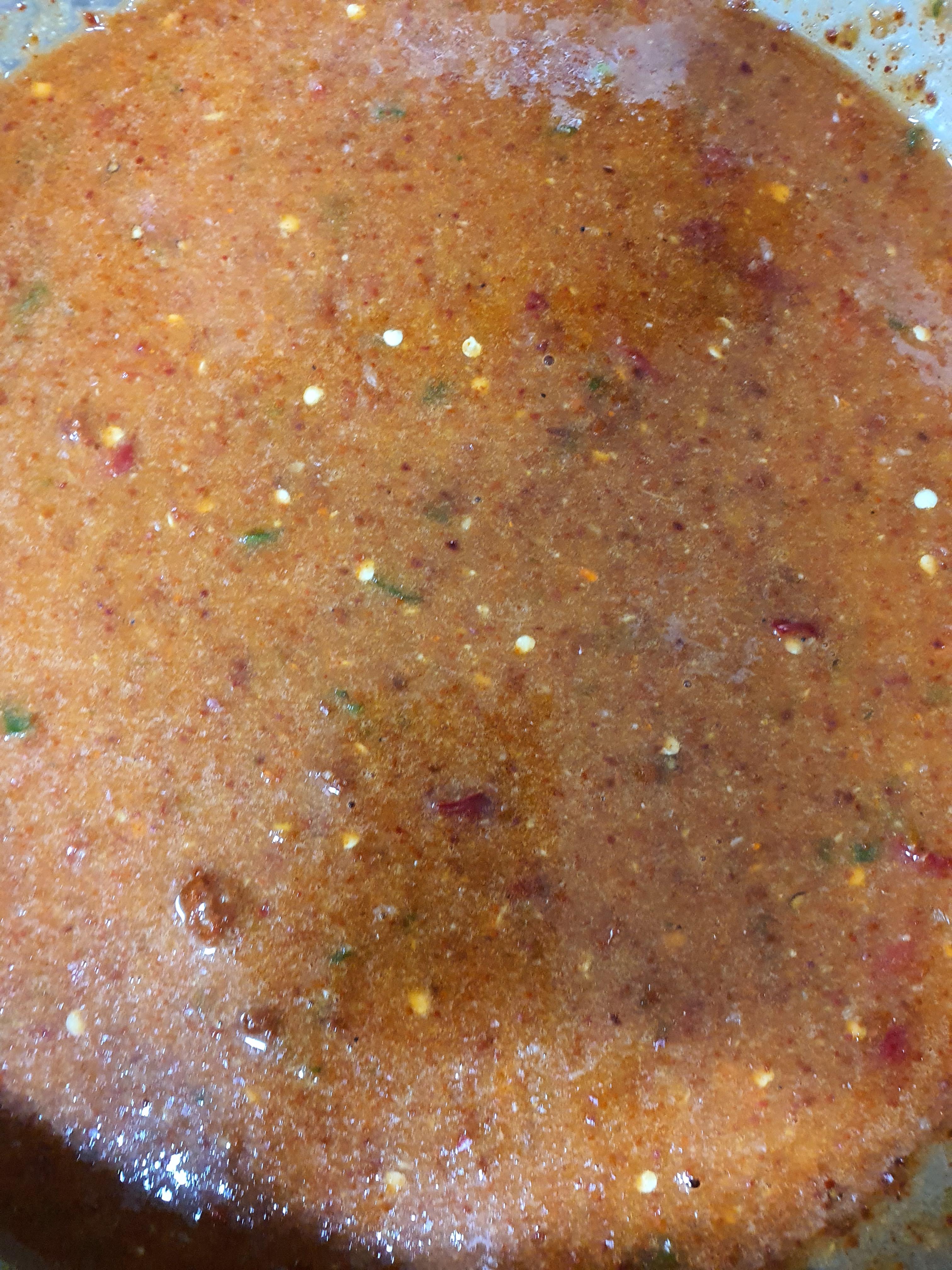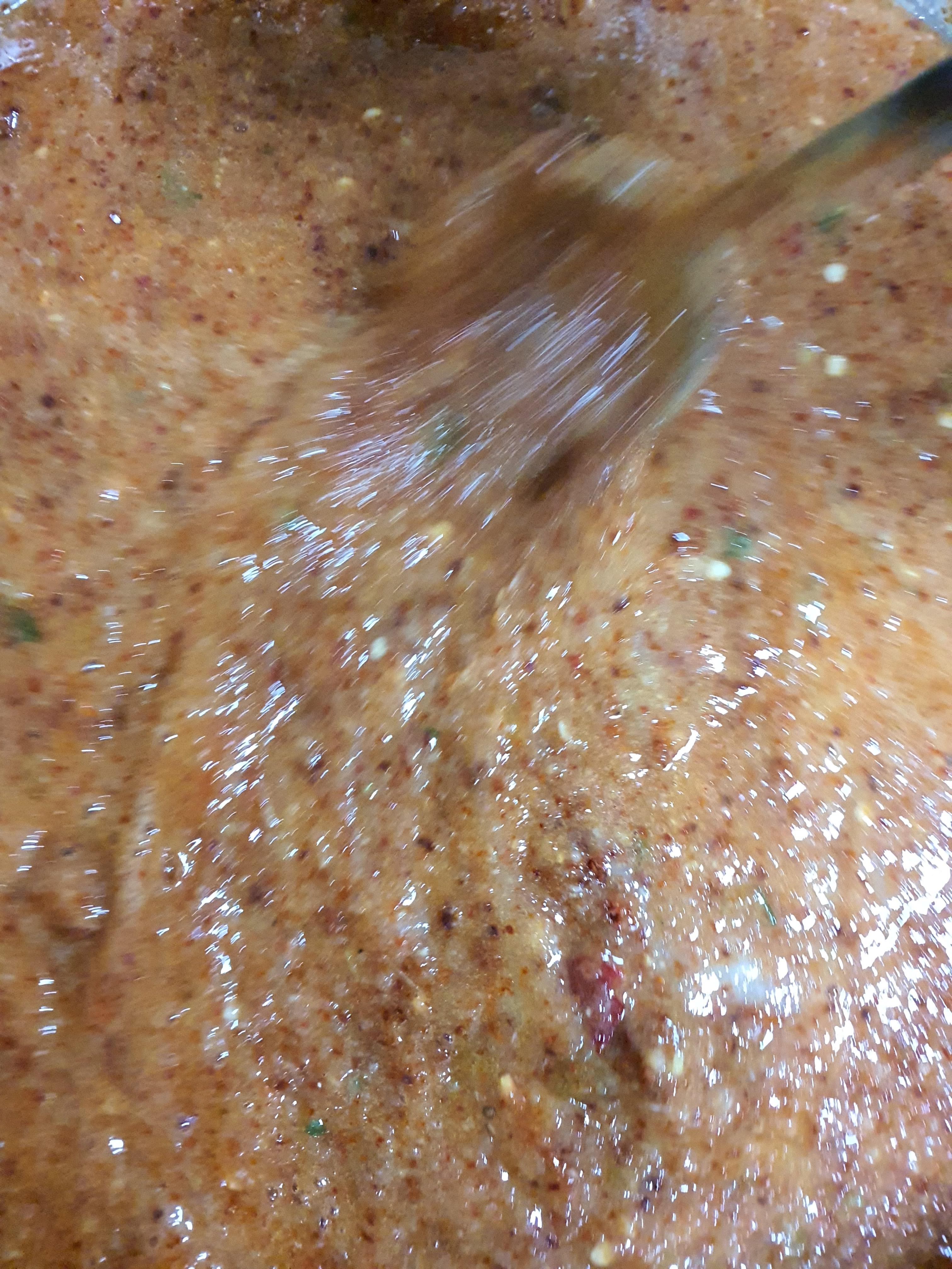 5. 양념 만들기를 합니다. 위에서 준비한 양념을 모두 섞어 줍니다. 특기 홍고추와 청고추는 너무 곱게 갈지 않습니다.