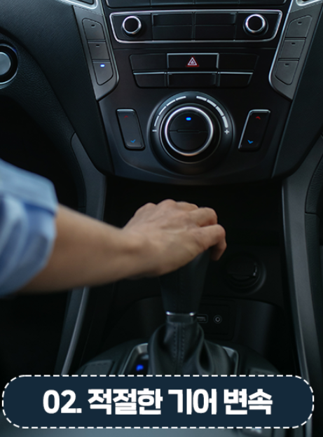 기어 변속은 차량의 속도·도로의 구조·교통량 등의 여건에 맞춰 신속히 실시하여야 합니다. 그리고 주행 도로상에서 엔진이 무리가 없는 한 고단 기어를 사용하여 주행하는 것이 연료가 절약됩니다.