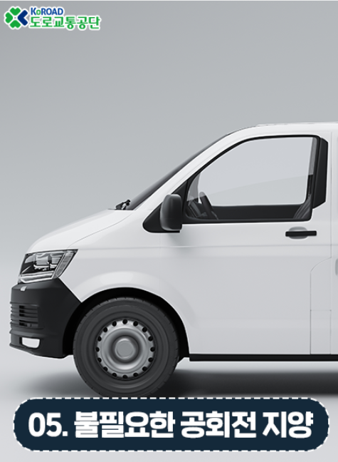 1분 동안 공회전을 하면 10~20cc 연료가 소비된다고 합니다. 5분 공회전 시 약 1km를 주행할 수 있는 연료가 낭비되는 것입니다. 공회전을 꼭 해야 한다면 변속기는 중립(M)으로 놓는 것을 추천합니다. 추운 겨울철에는 배출가스를 안정적으로 유지하기 위해 2분 이내의 공회전이 바람직하므로 연료 소모가 많은 지나친 공회전을 삼가해야 합니다.