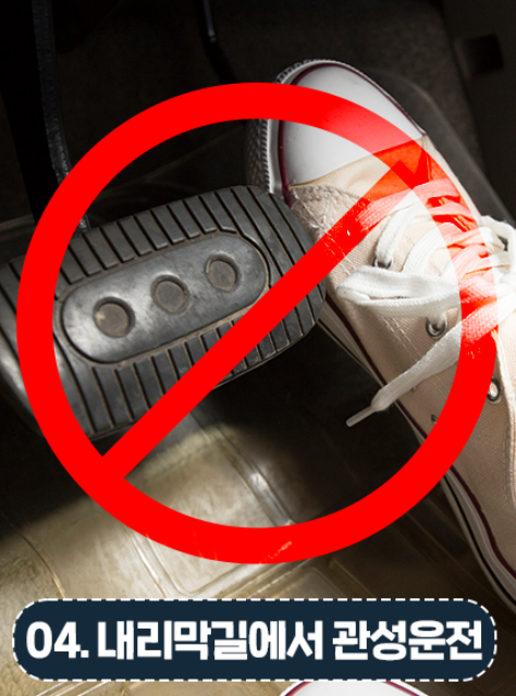 내리막길에서는 가속 페달을 밟지 말고 운전하는 것을 권장합니다. 단, 내리막에서 기어를 중립에 넣거나 시동을 끄면 더 위험하기 때문에 주의해야 합니다.