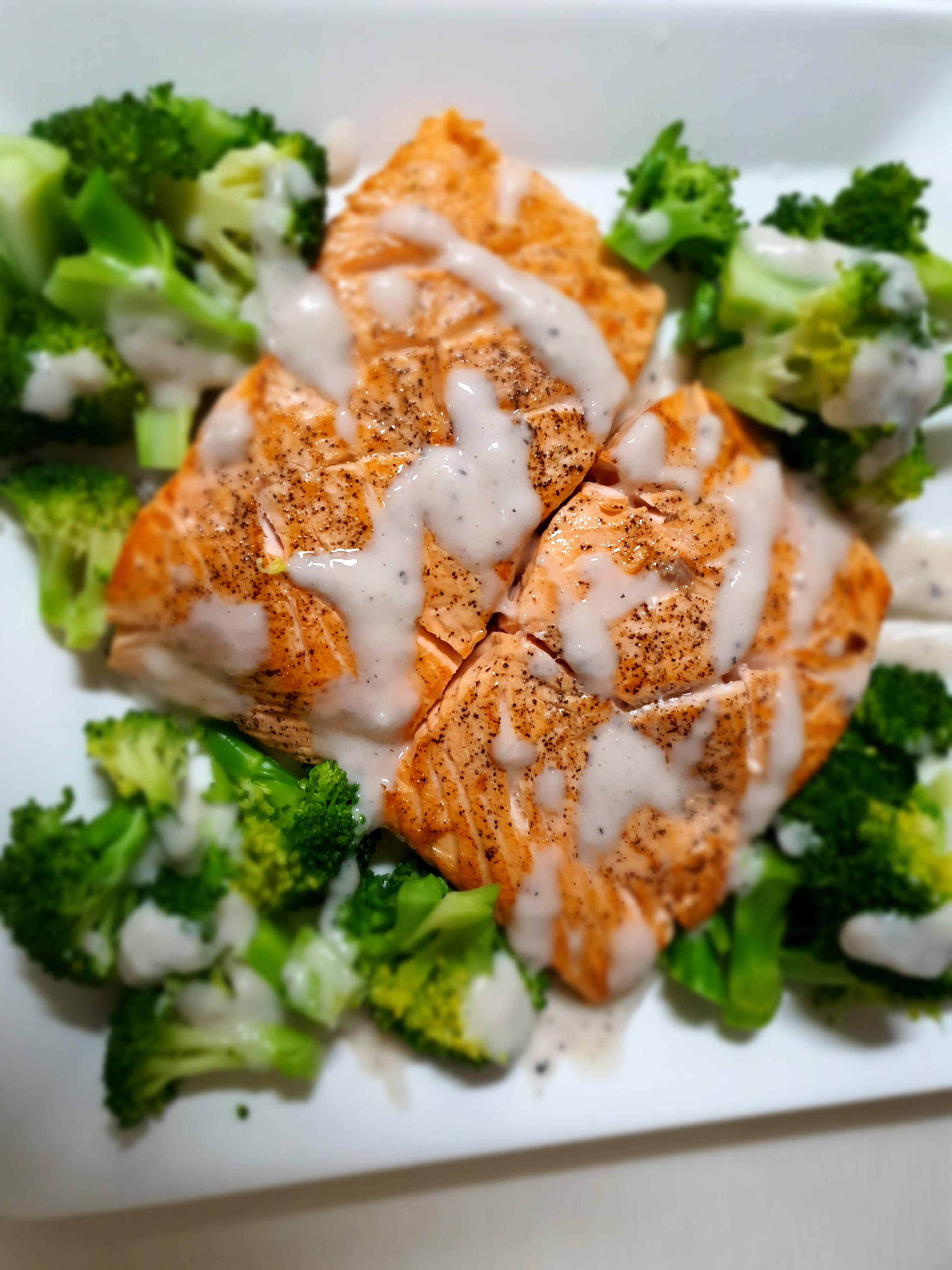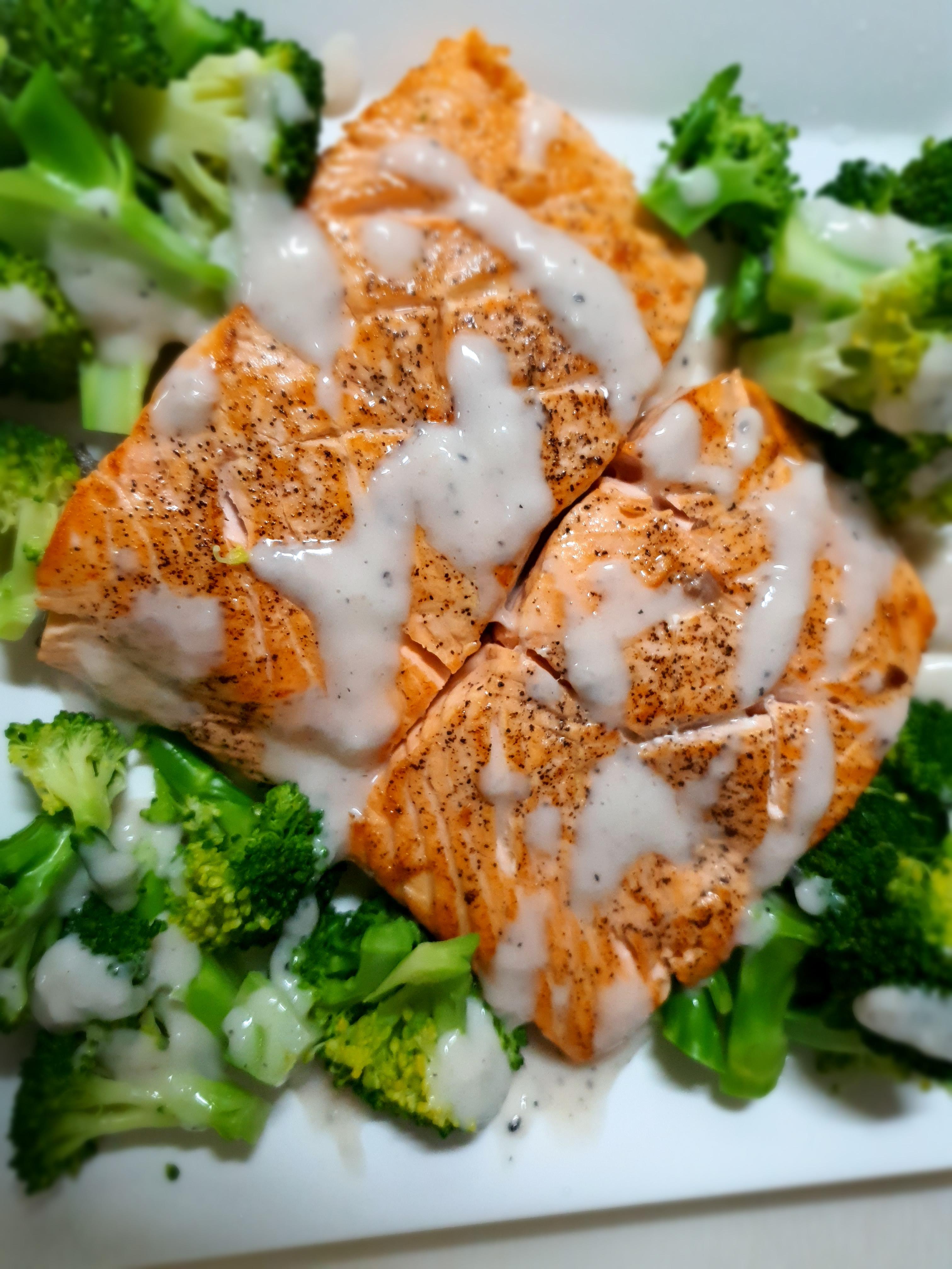 6. 그릇에 맛있게 익은 연어를 올리고, 브로콜리도 올리고, 소스를 솔솔 뿌려줍니다.