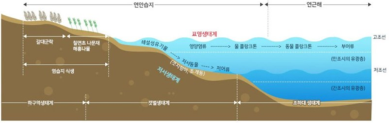 염생식물은 주로 갯벌의 생태계를 담당하며 먹이사슬의 기반이자 시작점이 됩니다. 하천과 유지에서 흘러들어오는 유기 영양분, 바다에서 들어오는 무기 영양분을 체내에 가득 저장하고 그 몸의 일부를 땅에 떨어뜨려 갯벌의 플랑크톤, 게, 갯지렁이 등 갯벌 생물의 먹이가 되어줍니다. 또한, 해양생물의 서식처, 피신처, 이동통로가 되어주어 생물의 다양성을 높이는 데 도움이 된다고 합니다.
