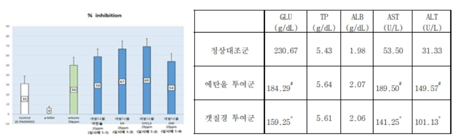 다른 예로 잎이 가늘어 세발나물이라고 불리는 염생식물은 추출물을 피부 세포에 처리한 결과 미백용 화장품 원료로 널리 사용되고 있는 알부틴보다 멜라닌 합성 억제 효과가 1.38배 우수해 특허로 등록되어 화장품 원료로 활용 중이라고 합니다. 또한 해안가 땅에 붙어 자라는 갯질경의 경우 알코올로 지방간이 유도된 쥐에게 섭취시켰을 때, 간 손상 지표인 ALT 성분이 149에서 101로 감소하여 염생식물의 기능성 소재로서의 무궁무진한 가능성을 보여주었다고 합니다.