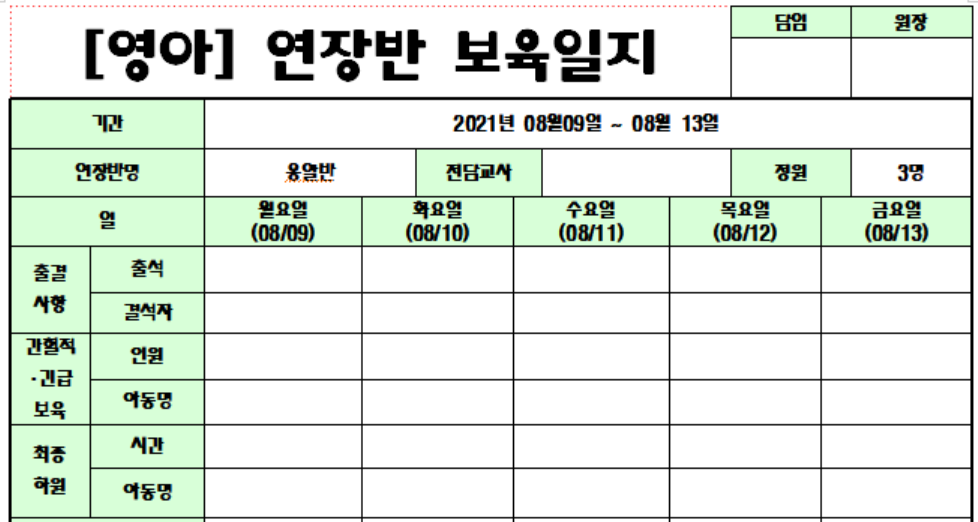 영아 연장반 보육일지 서식 필요하시면 다운 받아서 쓰시면 될 것 같습니다.