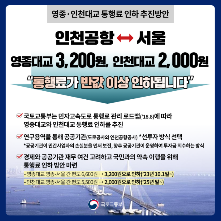 영종대교 통행료가 10월 1일부터 6600원에서 3200원으로, 인천대교의 통행료는 '25년 말부터 5500원에서 2000원으로 인하됩니다.