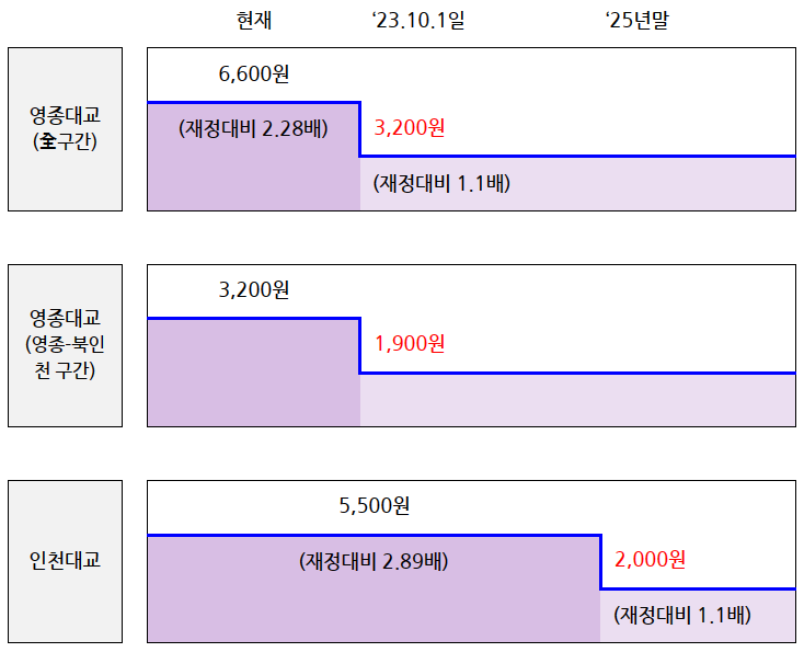 인천대교는 민간사업자에게 보전해야 할 금액이 크므로 경제여건 및 공공기관 재무여건을 고려하여 '25년 말부터 편도 5,500원에서 2,000원으로 재정 고속도로 대비 2.89배에서 1.1배로 통행료를 인하한다고 합니다.