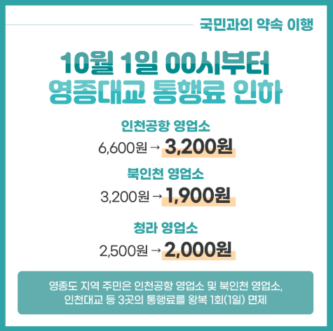 아울러 인천광역시에서 추진하고 있는 영종도 등 지역주민 할인도 확대된다고 합니다. 오는 1일(일)부터 지역 주민들은 영종대교의 인천공항 영업소 및 북인천 영업소, 인천대교 등 3곳의 통행료를 왕복 1회(1일) 면제받아 무료로 다닐 수 있게 되었습니다.