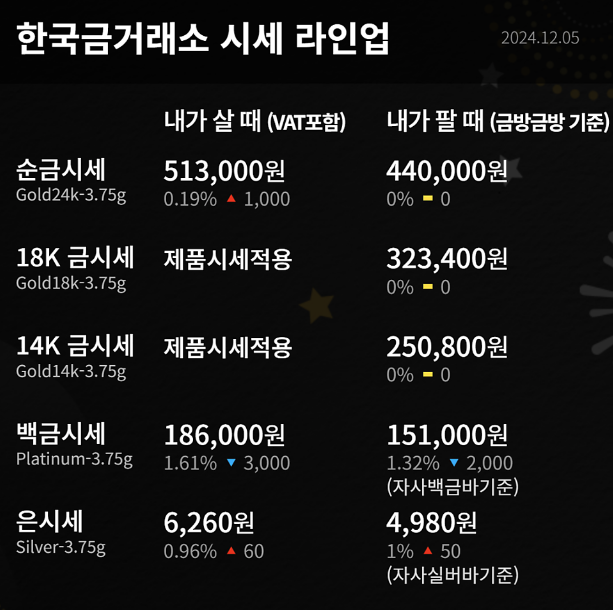 백금 시세는 3.75g당 전날 마감 시세보다 4,000원 상승한 165,000원을 기록하고 있으며, 은시세는 3.75g당 전날 마감시세보다 40원 상승한 5,270원을 기록하여 팔 수 있다고 합니다.