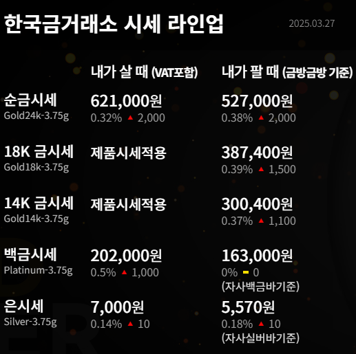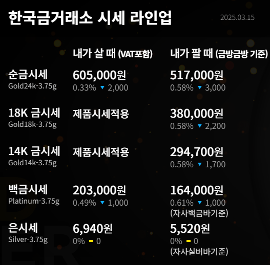 백금 시세는 3.75g당 전날 마감 시세보다 1,000원 하락한 201,000원을 기록하고 있으며, 은시세는 3.75g당 전날 마감 시세보다 10원 하락한 6,550원을 기록하고 있다고 합니다.