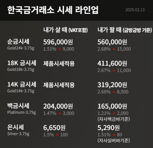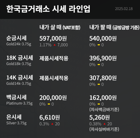 2025년 2월 12일 장마감 금시세는 내가 살때 24k 기준 금값 시세는 3.75g당 전날 마감 시세보다 5,000원 하락한 587,000원을 기록하고 있다고 합니다.