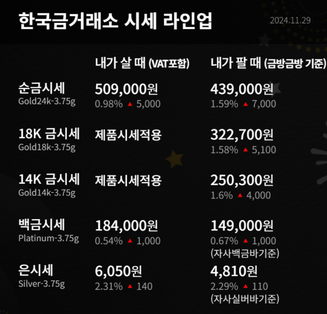 내가 팔때는 24k 금시세 기준 3.75g당 전날 마감 시세보다 4,000원 상승한 441,000원이며, 18k 금시세 기준 3.75g당 전날 마감 시세보다 3,000원 상승한 324,200원을 기록하고 있습니다. 또, 14k 금시세 기준 금값시세는 3.75g당 전날 마감 시세보다 2,300원 상승한 251,400원을 기록하고 있다고 합니다.