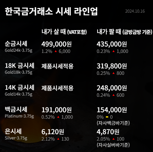 10월 18일 마감 금시세로 내가 살때 24k 금시세 기준 금값시세는 3.75g당 전날 마감 시세보다 4,000원 상승한 508,000원을 기록하고 있습니다.