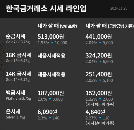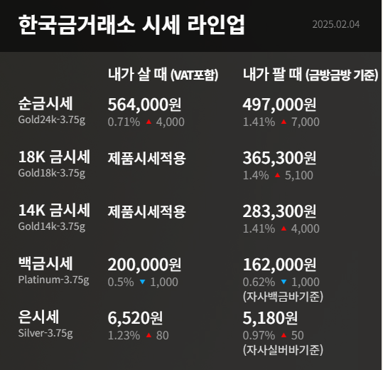 내가 팔때는 24k 금시세 기준 3.75g당 전날 마감 시세보다 2,000원 상승한 437,000원이며, 18k 금시세 기준 3.75g당 전날 마감 시세보다 1,400원 상승한 321,200원이며, 14k 금시세 기준 금값시세는 3.75g당 전날 마감시세보다 1,100원 상승한 249,100원을 기록했다고 합니다.
