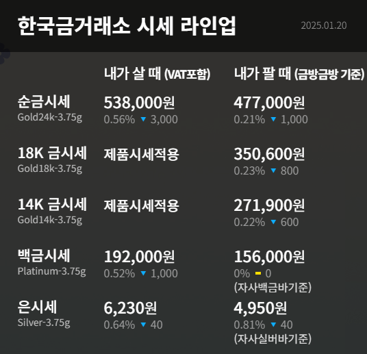 백금시세는 3.75g당 전날 마감 시세보다 1,000원 상승한 156,000원을 기록하고 있으며, 은시세는 3.75g당 전날 마감 시세보다 30원 하락한 5,050원을 기록하여 팔 수 있다고 합니다.