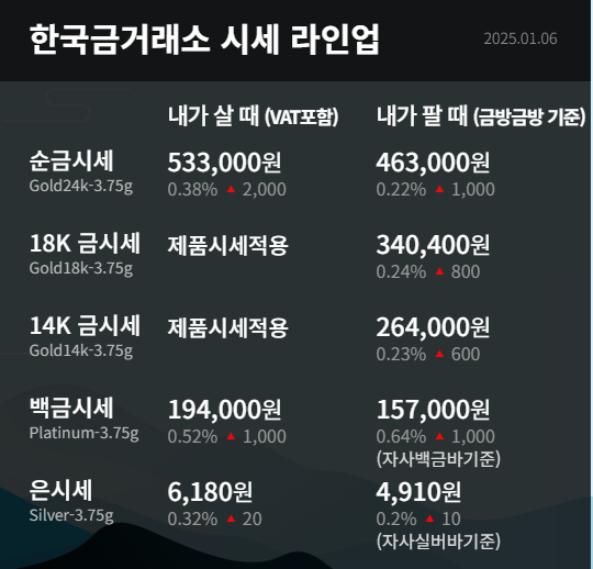 내가 팔 때는 24k 금시세 기준 3.75g당 전날 마감 시세보다 1,000원 상승한 463,000원을 기록하고 있으며, 18k는 금시세 기준 3.75g당 전날 마감 시세보다 800원 상승한 340,400원을 기록하고 있으며, 14k는 금시세 기준 금값 시세는 3.75g당 전날 마감 시세보다 600원 상승한 264,000원을 기록하고 있습니다.