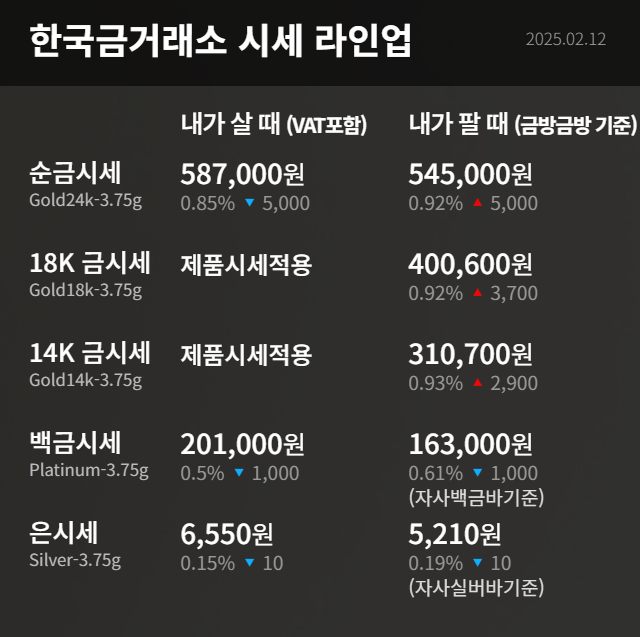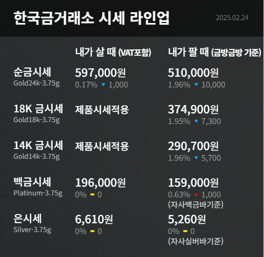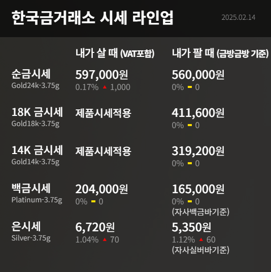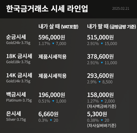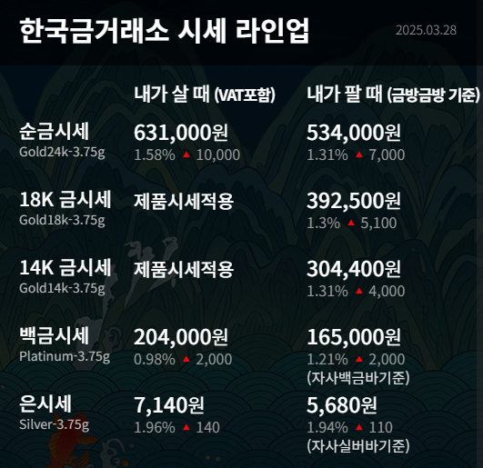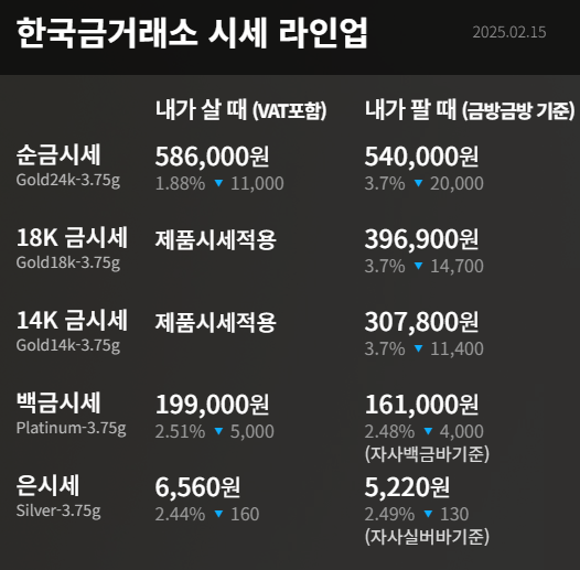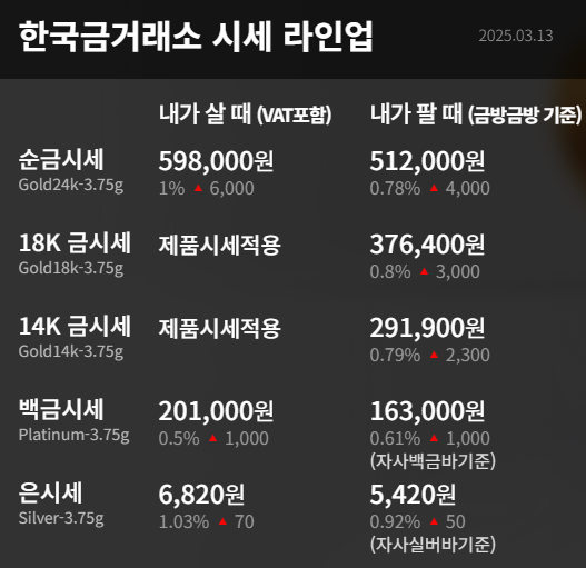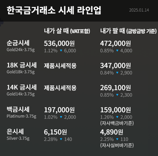 백금시세는 3.75g당 전날 마감 시세보다 1,000원 상승한 156,000원을 기록하고 있으며, 은시세는 3.75g당 전날 마감 시세보다 30원 하락한 5,050원을 기록하여 팔 수 있다고 합니다.
