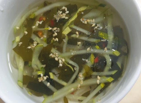 오이미역냉국은 냉장고에 넣어두었다가 차갑게 먹는 것이 좋으며, 깨도 뿌려주면 맛있게 먹을 수 있습니다. 오이는 조직의 90%가량이 수분으로 이루어져 있기 때문에 여름철 부족한 수분을 보충해 주는 역할을 하는데, 이런 차가운 성질 덕분에 체내의 열을 지정시켜 주고, 면역력 향상을 도와주며 체내의 활성 산소를 제거하는 역할도 한다고 합니다.