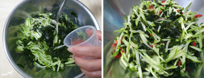 5. 그다음 물 800ml 정도를 부어주면 오이미역냉국이 완성됩니다. 물을 조금씩 넣어서 양념이랑 간이 맞을 수 있도록 조절해 줍니다.