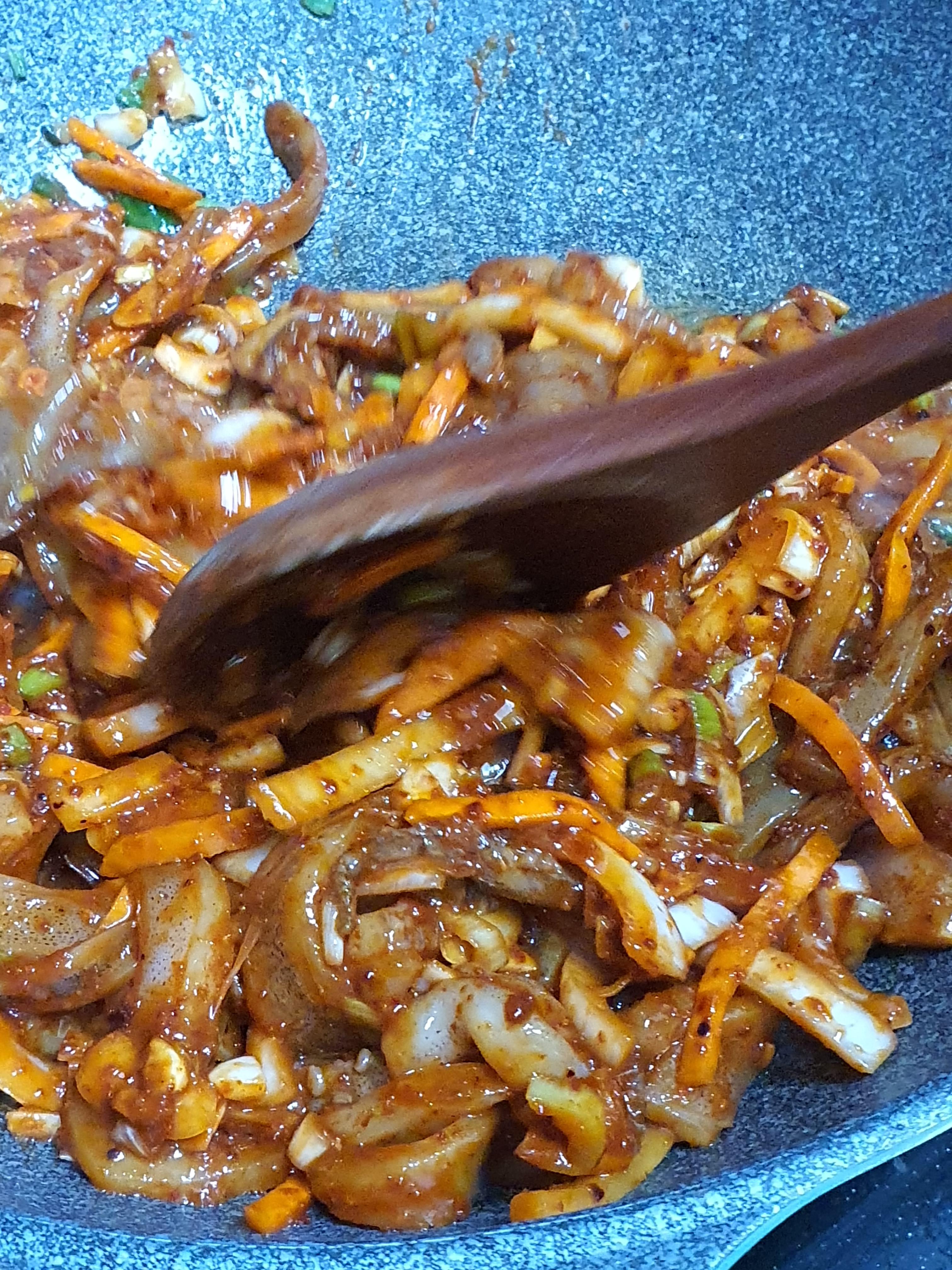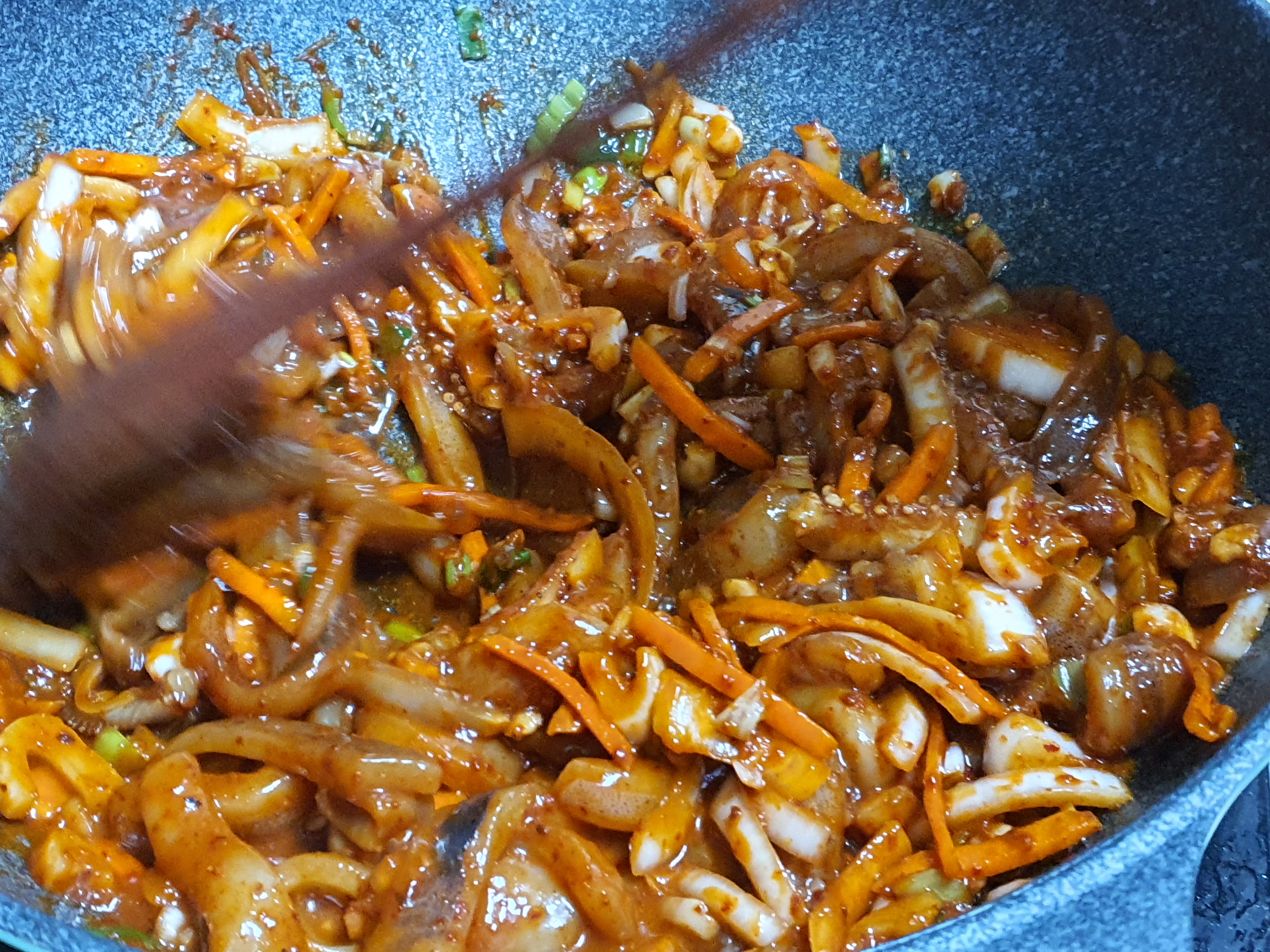 5. 숙성한 오징어를 넣고 센불로 볶아줍니다.