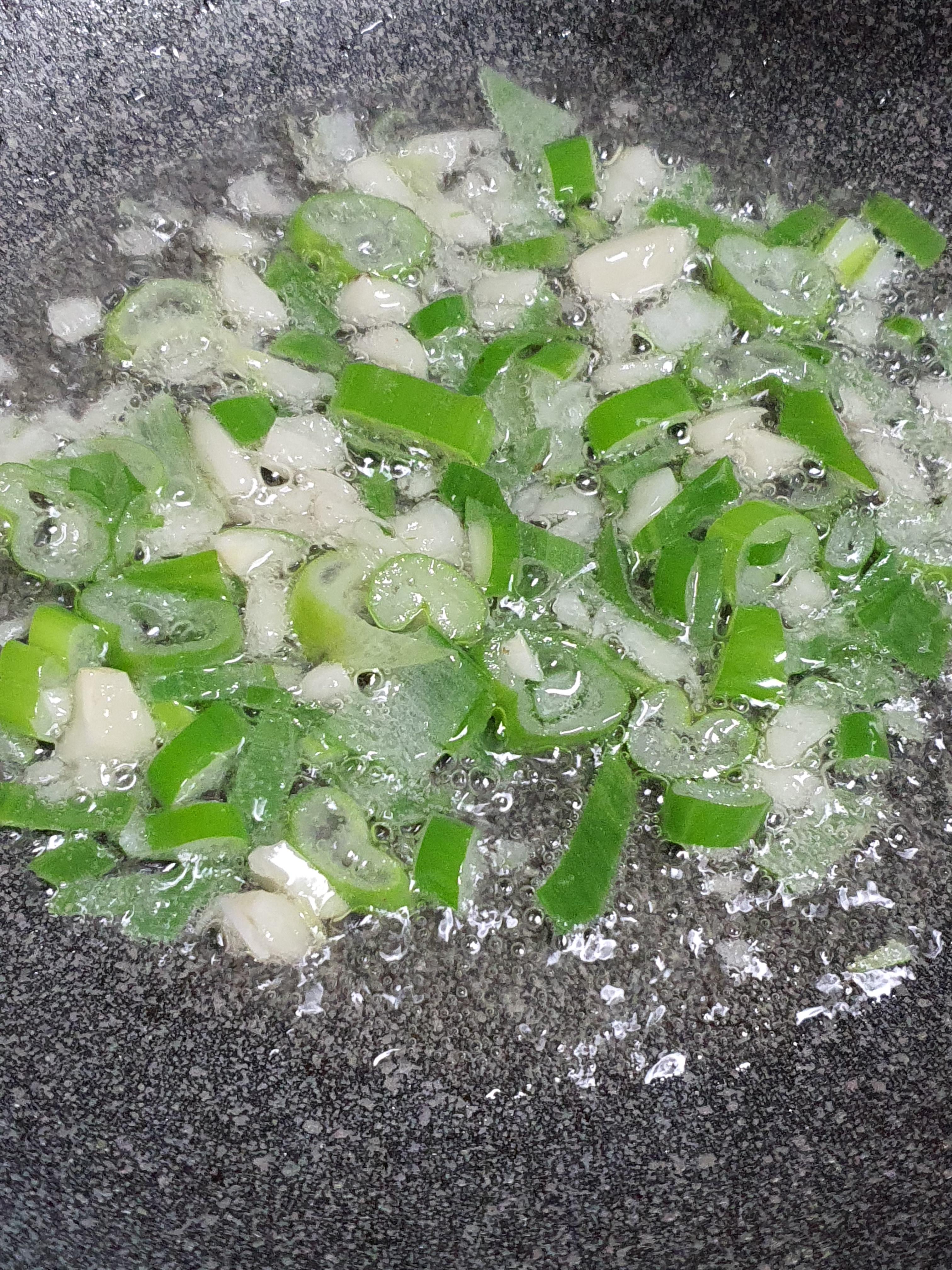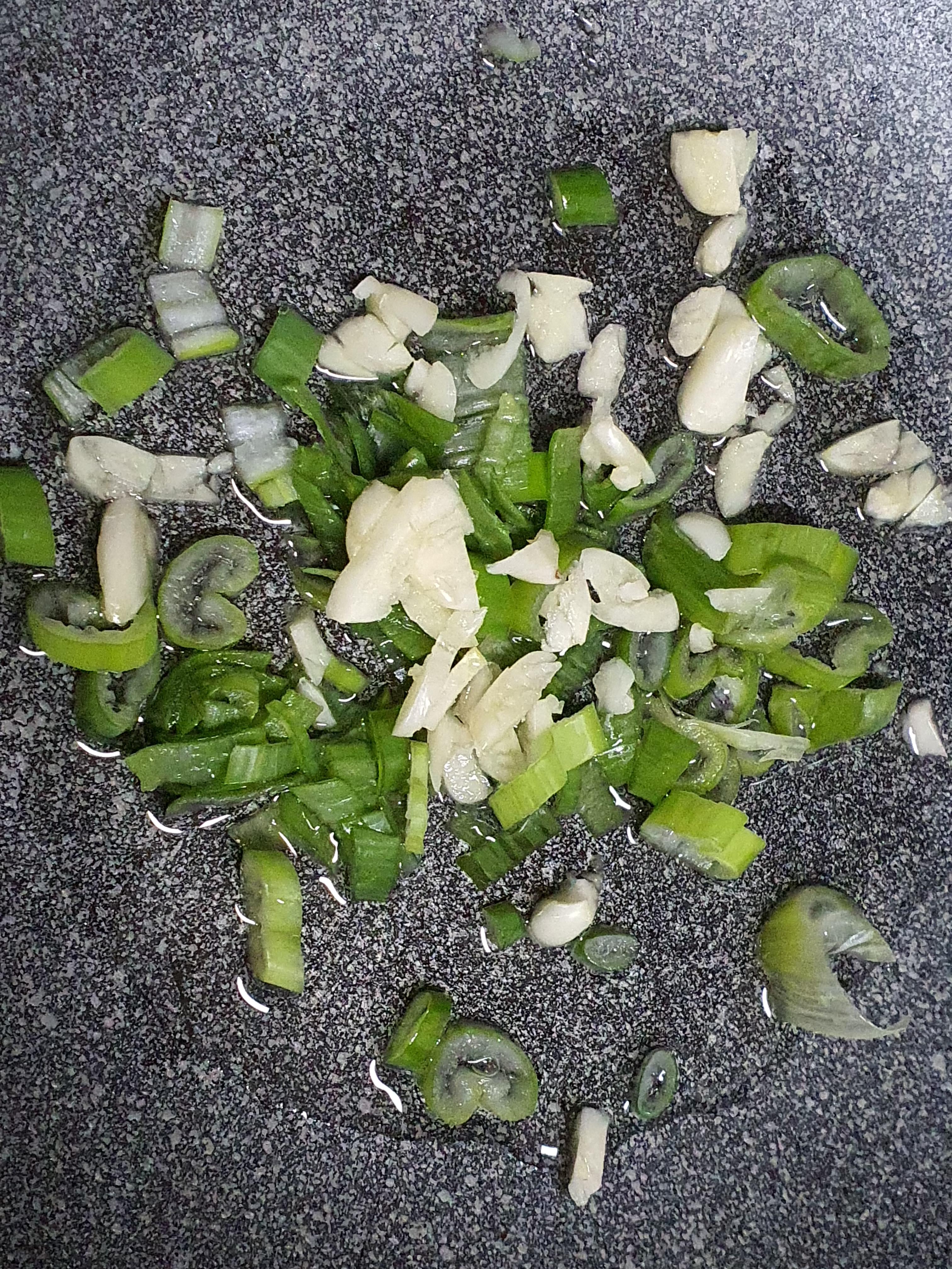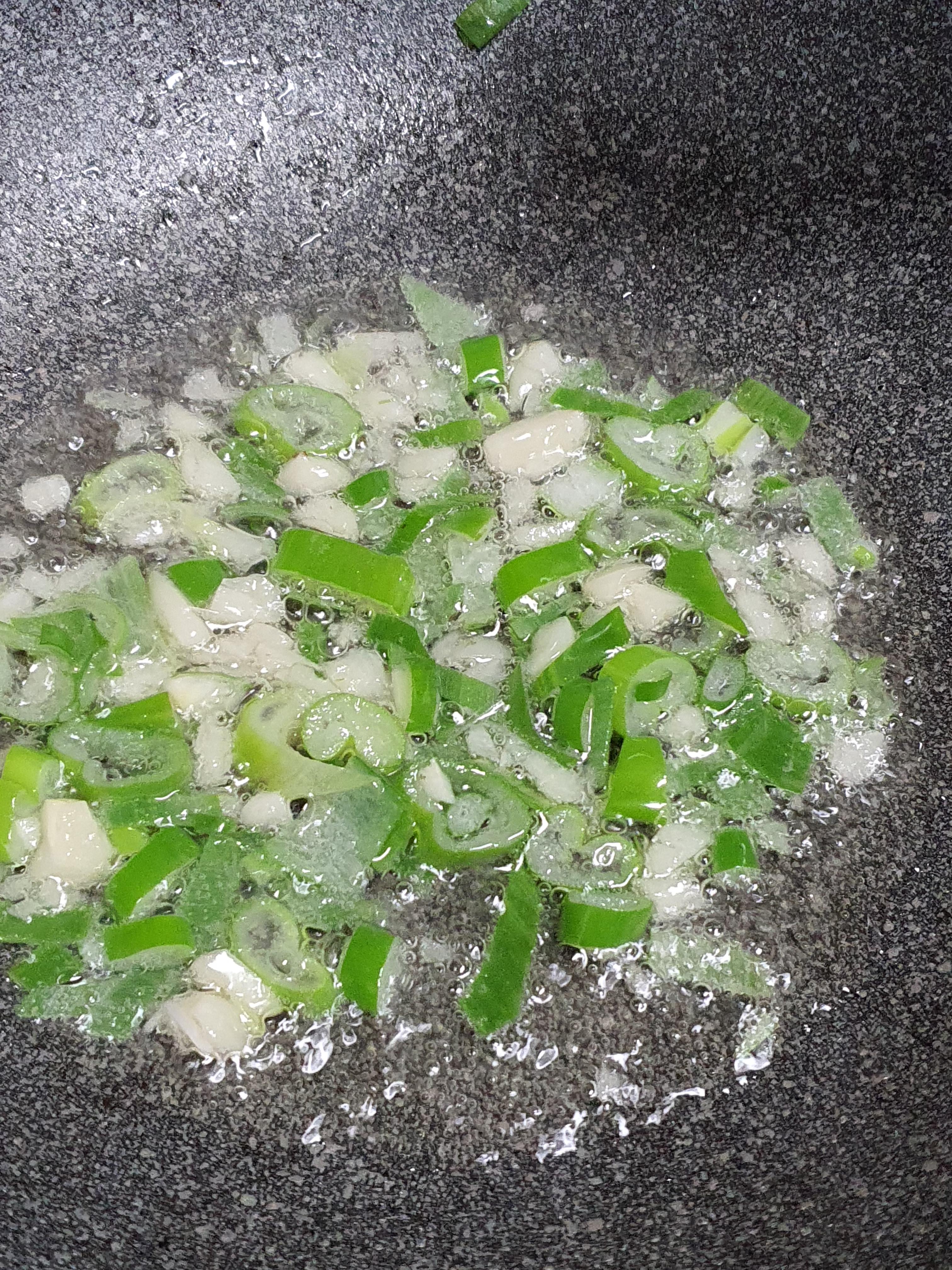 4. 웍에 식용유 1/3컵과 다진마늘 1숟가락, 다진 파 반쪽을 넣어 파기름을 내줍니다.