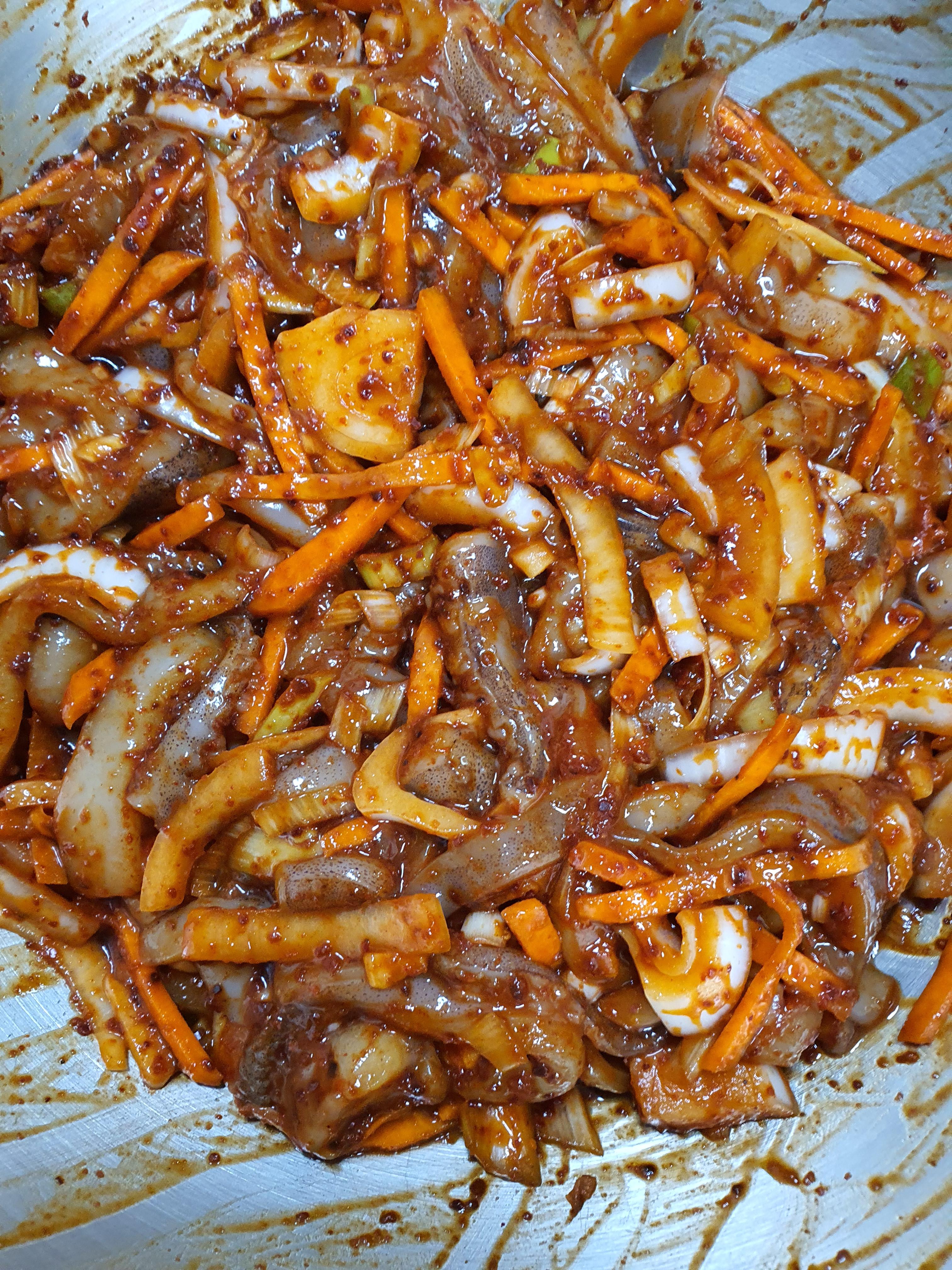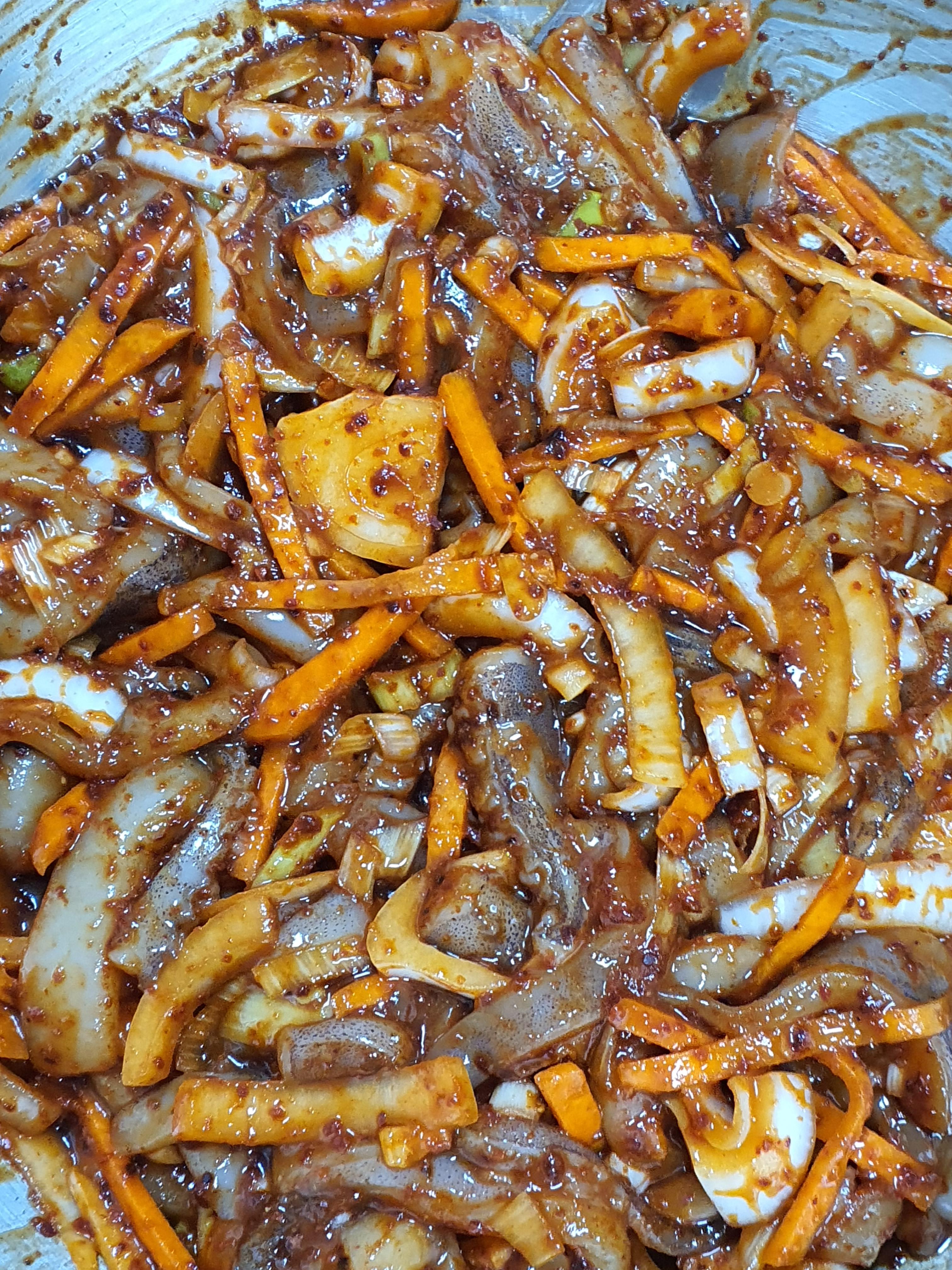 썰어놓은 오징어와 양념장을 잘 버무려 30분간 숙성시켜 줍니다.