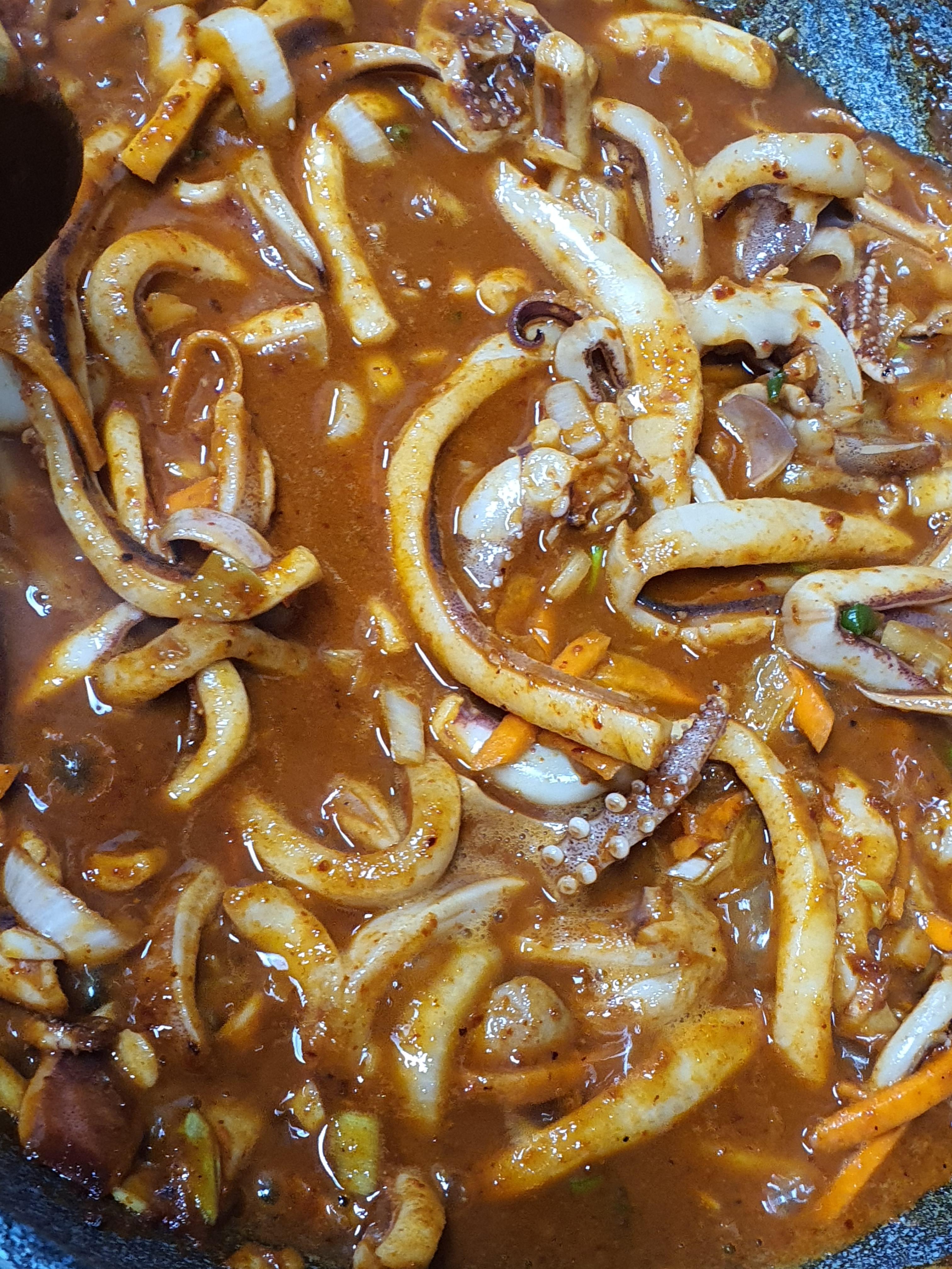 오징어, 고춧가루, 고추장, 간장, 설탕, 마늘, 양파, 당근, 파, 후추, 참기름, 청량고추, 치킨스톡, 조청, 식용유, 물