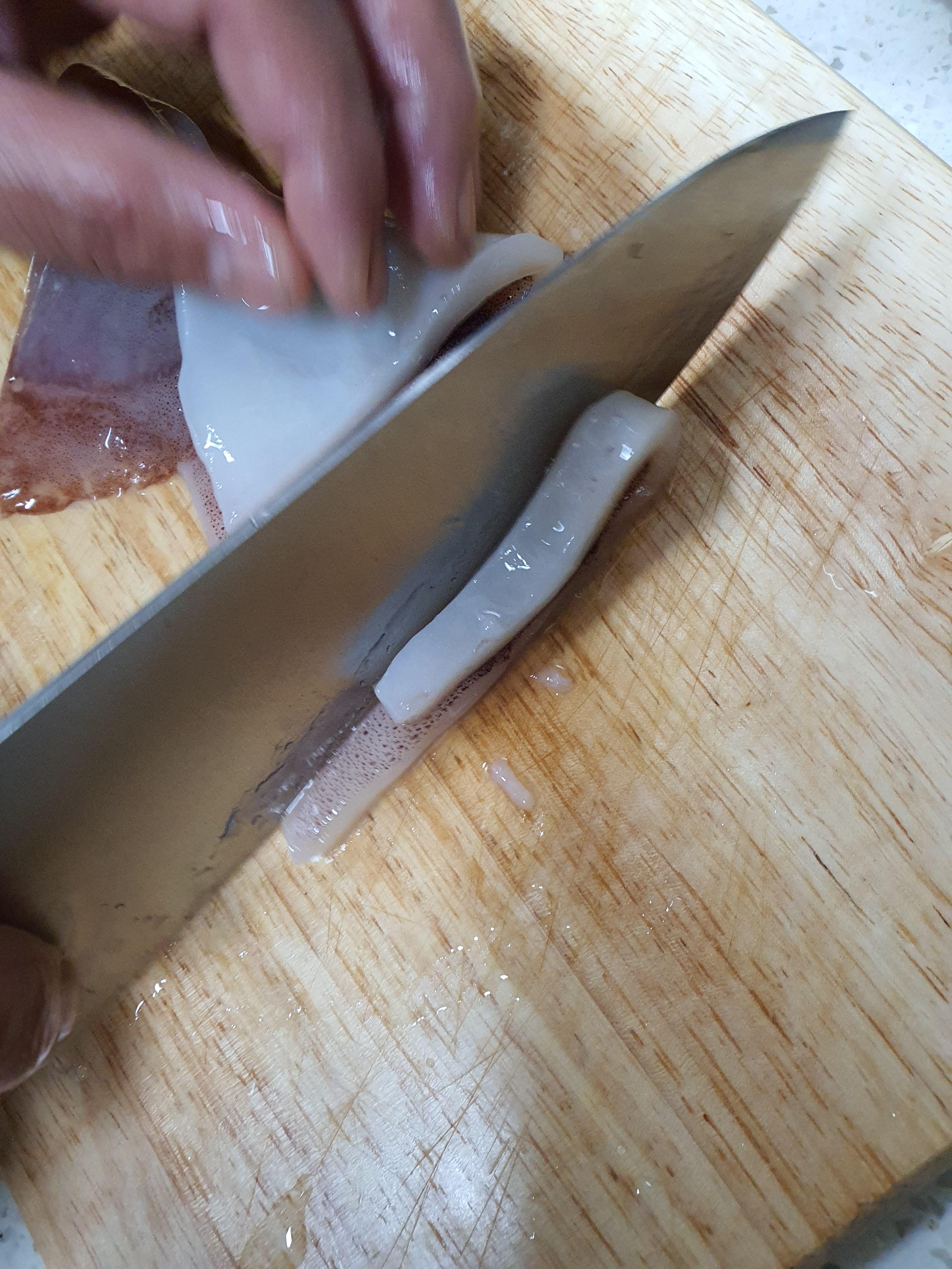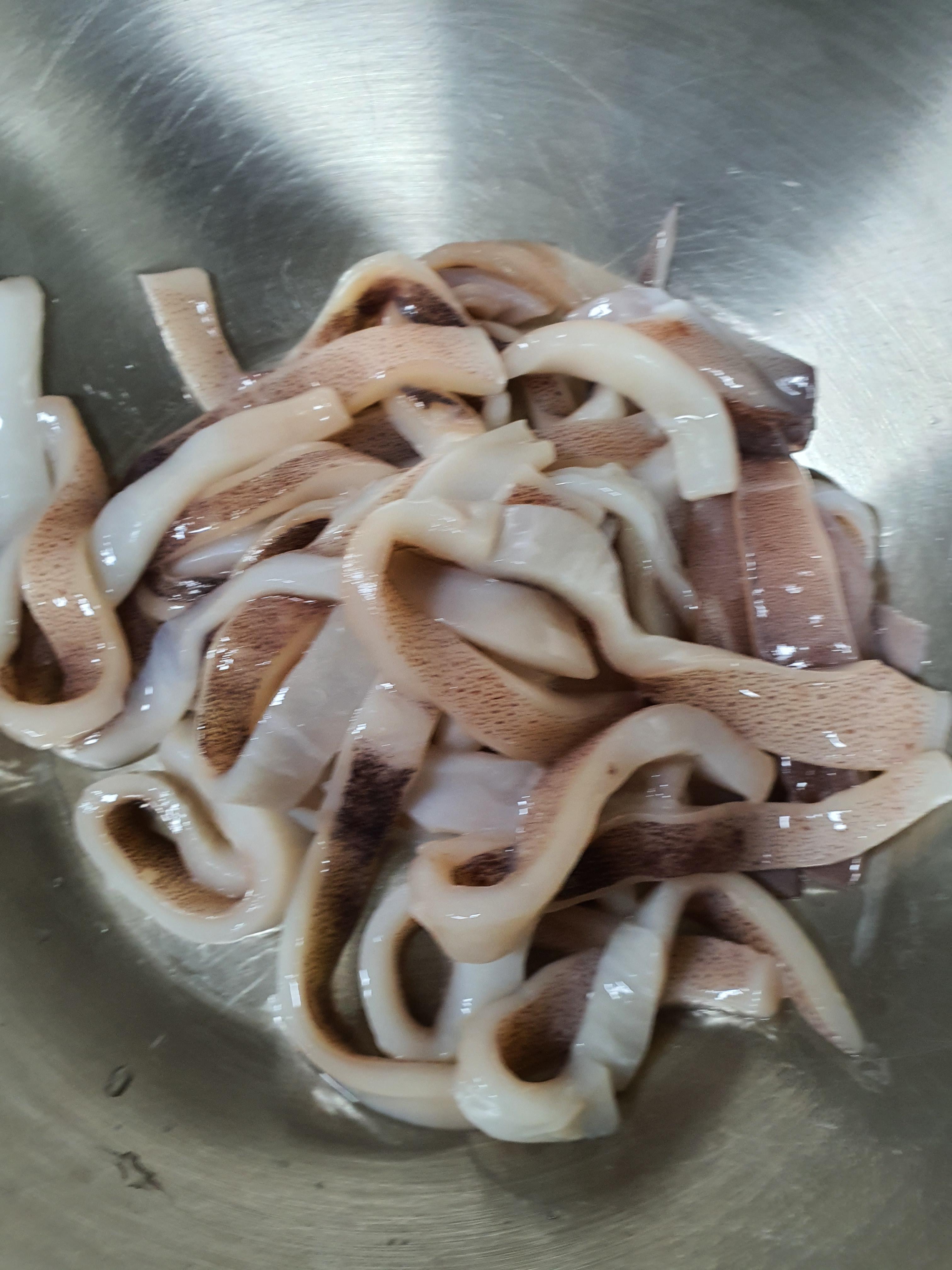 큰 오징어 2마리를 내장 제거 후 흐르는물에 깨끗이 씻어주고 먹기 좋게 썰어 놓습니다.