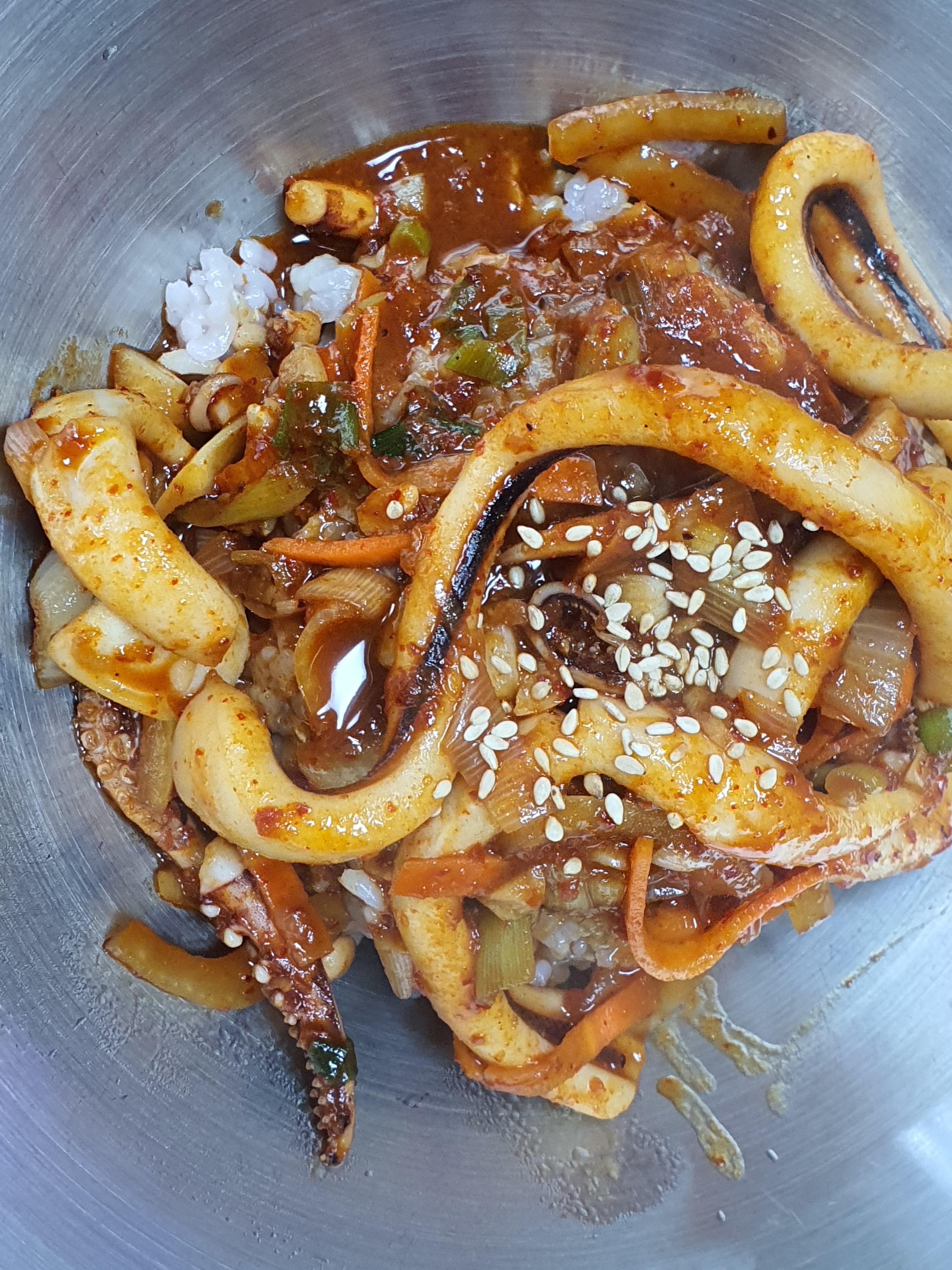 너무 오래 볶으면 오징어가 질겨질 수 있습니다. 최대한 센불로 빨리 요리를 완성해주면 맛있는 오징어 덮밥을 드실 수 있습니다.
