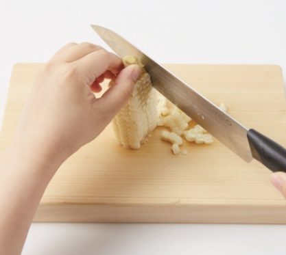 3. 옥수수를 도마 위에 세우고 칼날을 옥수수 대에 바짝 붙여 위에서 아래로 긁어 알만 발라냅니다.