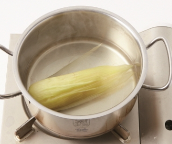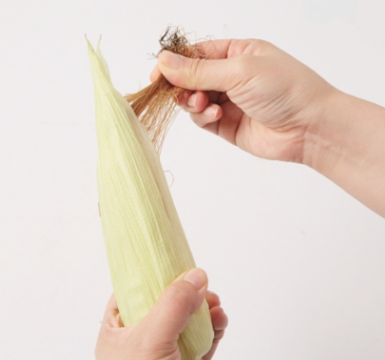 1. 옥수수는 속잎 1~2장을 제외한 나머지 잎과 수염을 떼어냅니다.