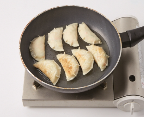 7. 식용유 1/4컵을 둘러 중간 불로 달군 팬에 만두를 앞뒤로 노릇하게 굽습니다.