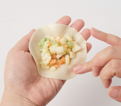 6. 만두피에 소를 얹어 납작하게 빚어줍니다.