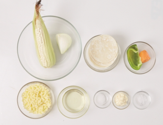 옥수수 1대, 양파 1/6개, 만두피 10장, 설탕 1t, 소금 1/2t, 당근 1/8개, 청피망 1/4개, 마요네즈 2T, 슈레드 모차렐라 치즈 100g, 식용유 1/4컵