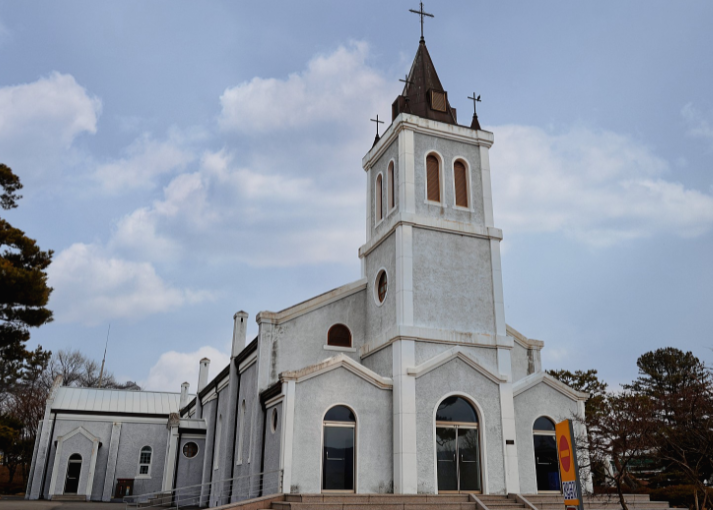 충청북도에 유일하게 남은 1940년대 천주교 성당으로, 설립된 것은 1945년 또는 1948년으로 추정된다고 합니다. 멜리놀외방전교회 미국인 사제가 건립한 서양식 성당으로 언덕 위에 지어져 도로와도 떨어져 있고, 도심과도 떨어져 있는 느낌이 드는 곳이라고 합니다. 그래서 고요하고 한적하다고 합니다. 성당 종탑을 들여다보면 종탑의 종은 프랑스에서 들여온 것으로 종소리가 매우 청아하다고 합니다. 성당 위로 뭉게뭉게 파란 하늘이 피어올라 성당 색과 경계가 모호하여 매력적인 색의 성당이 된다고 합니다.