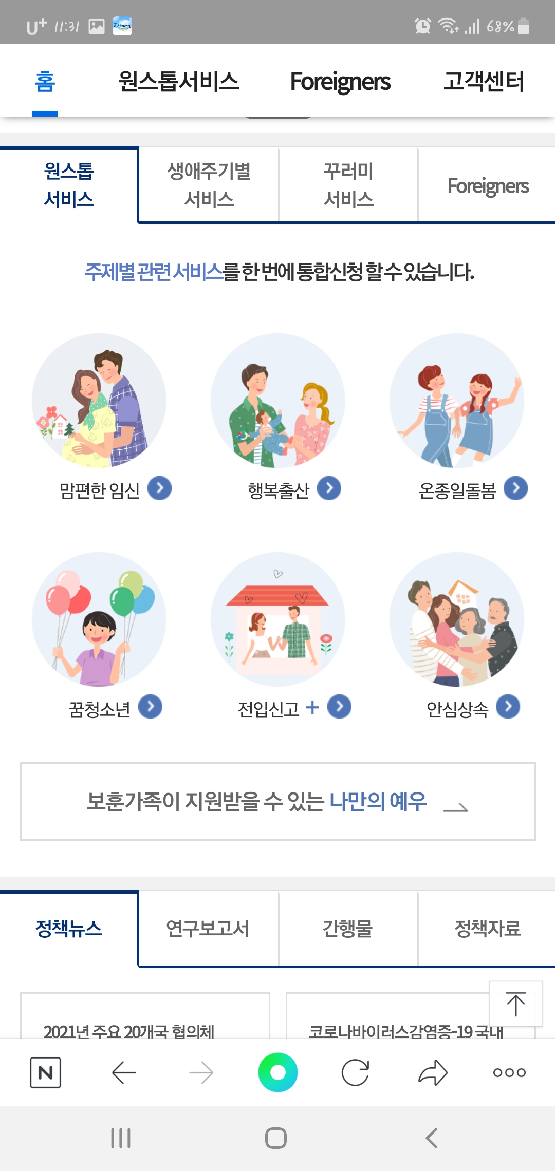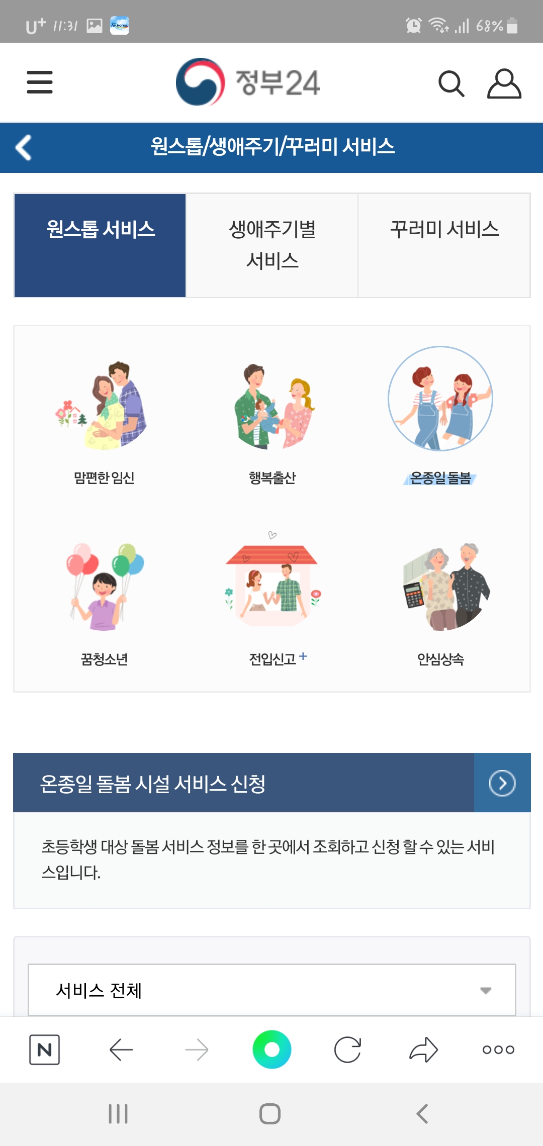 맘편한 임신, 행복출산, 온종일돌봄, 꿈청소년, 전입신고, 안심상속 중 온종일돌봄을 클릭해줍니다.