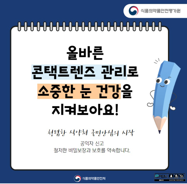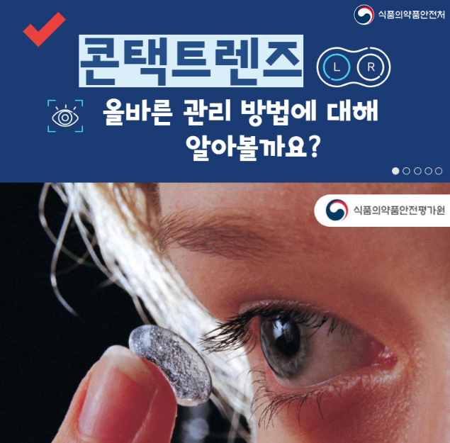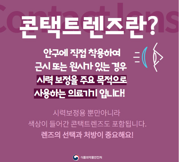 콘택트렌즈란 안경 대신 눈의 각막에 직접 붙여서 사용하는 렌즈인 콘택트렌즈는 근시 또는 원시가 있는 경우 시력 보정을 목적으로 사용하는 의료기기입니다. 일부 미용을 위해 사용하는 색상이 들어간 콘택트렌즈도 의료기기인데, 낸 눈에 직접 사용하는 의료기기인 만큼 올바른 사용법이 더욱 강조됩니다.