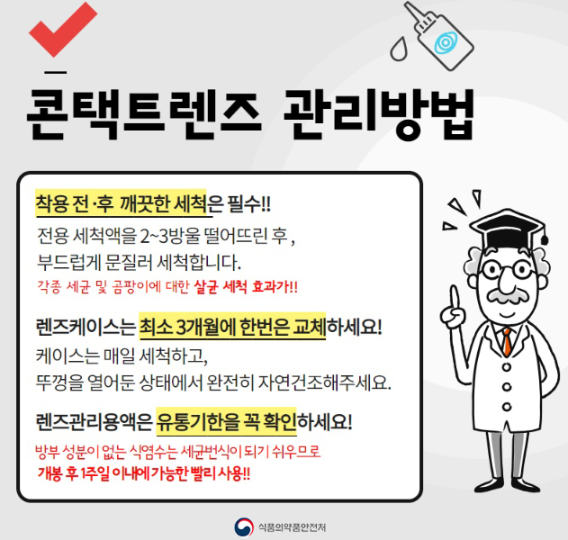콘택트렌즈를 사용할 때는 세균의 번식을 막는 것이 가장 중요합니다. 렌즈를 사용할 때는 전용세척액을 사용해 반드시 세척해야 합니다. 또, 세균 번식이 쉽게 일어날 수 있는 렌즈관리용액은 유통기한을 꼭 확인하고 가능한 한 빨리 사용합니다.