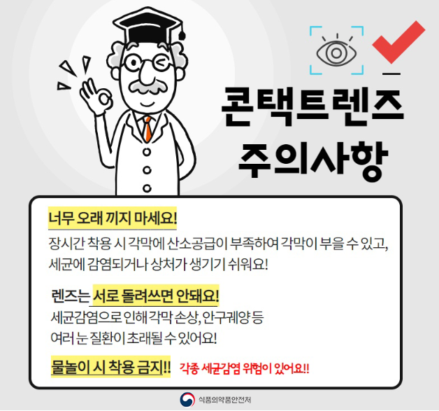 콘택트렌즈를 사용할 때는 언제든 각종 세균감염 위험이 있을 수 있으므로 너무 오래 끼지 않도록 하며, 서로 돌려쓰는 행위도 하지 않아야 합니다. 또, 물놀이 시에는 착용을 하지 않는 것이 좋습니다.